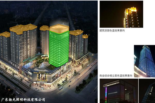 商業(yè)綜合樓立面面對著人流量較多,是燈光靚現(xiàn)的重要區(qū)域。色溫可選用暖黃或彩色光體體現(xiàn)現(xiàn)代時(shí)尚感。