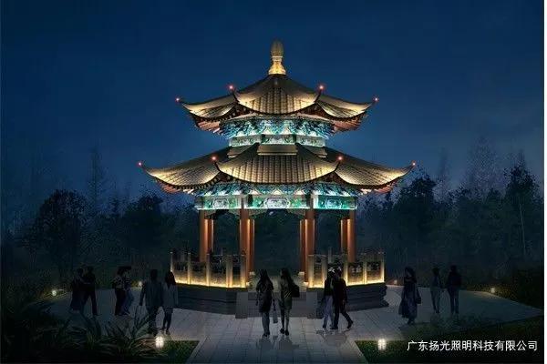 遠(yuǎn)瞻亭:建筑燈光亮度為整個軸線最低的區(qū)域,設(shè)計師以多種燈光設(shè)計手法體現(xiàn)飛檐,斗拱,主柱精致建筑結(jié)構(gòu)。