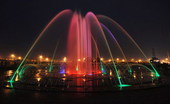 噴泉是富于動(dòng)態(tài),集聲、光、色、形于一體的設(shè)施。其中,光與色是同步產(chǎn)生和消失的,色必須通過光束才能表現(xiàn)出來。因此,應(yīng)將色與光同時(shí)考慮,統(tǒng)一安排。