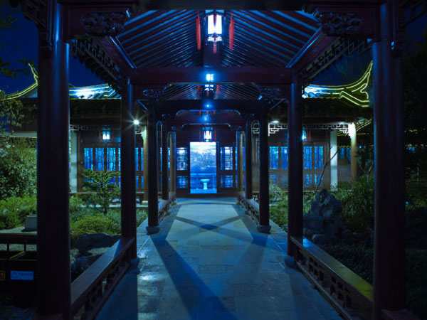 塑造庭院夜景重要的是景觀立意、定位以及希望傳遞給人們的感受,庭院空間是一般建筑物室內(nèi)室外空間之間的過渡,因而它的夜景形象塑造目標(biāo)應(yīng)給人一種家居感和溫馨感,同時又要給人一種室外環(huán)境的開敞感和公共感,因此,它的燈光景觀構(gòu)成中既要有精致細膩的墻面紋飾光影圖案,又應(yīng)有街道或廣場等開敞空間中所使用的燈光手法及空間氛圍;庭院夜景的塑造包括對圍合庭院的各單體建筑物立面的照明表現(xiàn)、各單體建筑物室內(nèi)燈光的適度配置、庭院之外延伸空間的照明、“借景”的燈光塑造、庭院內(nèi)部配置古典景觀燈的燈光塑造等。