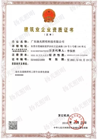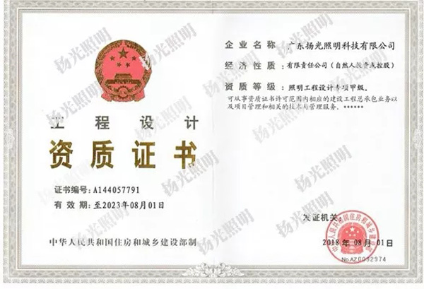 近日,揚光照明成功取得了由國家住房與城鄉(xiāng)建設(shè)部頒發(fā)照明工程設(shè)計專項資質(zhì)甲級,至此,公司已成為全國為數(shù)不多的城市及道路照明工程施工壹級,照明工程設(shè)計專項資質(zhì)甲級的“雙甲”企業(yè),“雙甲”資質(zhì)的取得體現(xiàn)了行業(yè)和市場對公司綜合實力的高度認(rèn)可,意味著可以承接任何規(guī)模的照明設(shè)計與施工項目。