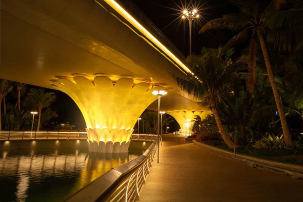 橋梁夜景亮化的燈具選擇具有安全防護、防腐、防震性能、防水性能,便于維護和更換。光源選擇長壽命、節(jié)能光源。燈具、配件及金屬管線接地應可靠,較高的橋梁應做防雷電保護措施,燈具安裝應牢固可靠,防止脫落傷人。